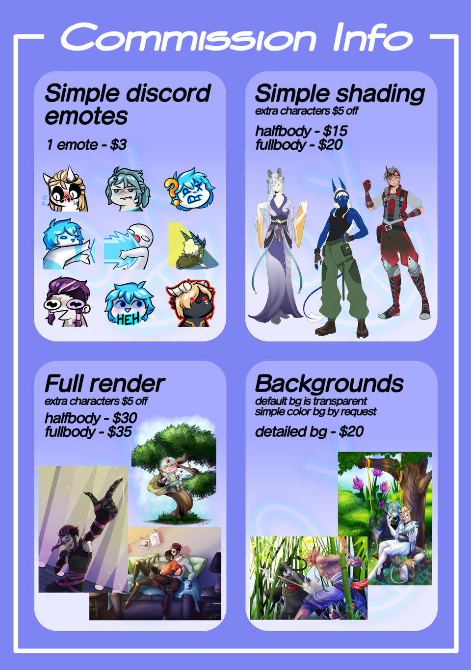 Note: Extra characters are 5$ off PER character.These commissions are based on a first come, first serve waiting list. I will reserve a spot and start on your project ONLY after all paid commissions before you, are complete. It is to prevent organizing several projects at once and loosing track of them all, however if the previous reserve did not pay, i might start slowly sketching your work.I accept PayPal only. Please keep in consideration any payment fees or currency exchange fees - i should receive the exact amount required. I send a watermarked sketch for any final changes/approval and will finish the piece after full payment is made.I reserve the right to decline any commission that i do not feel comfortable with. I do not draw: NSFW, extreme gore, fetishes and any offensive/hurtful topics that target any group.DISCLAIMER - My art IS NOT for commercial, NFT or AI use.